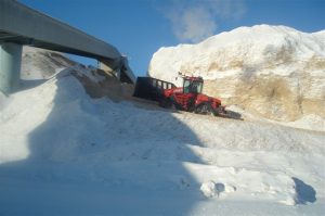 A `thumper’ roll just behind the head chute can be used to shake the frozen snow and dust off the return belt.